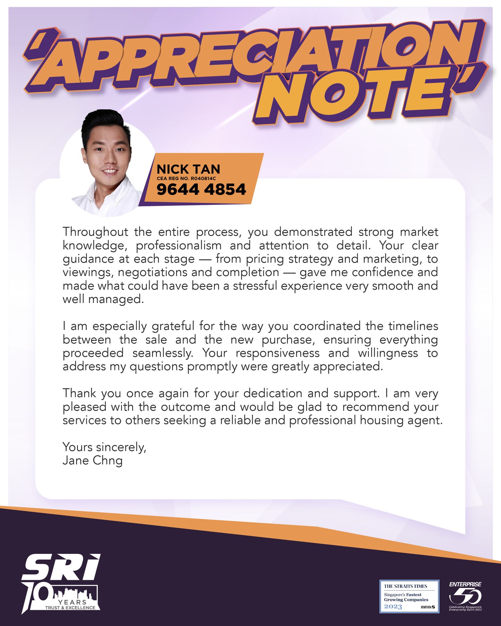 I had a very positive experience working with Nick Tan on the sale of my flat. From the beginning, he demonstrated strong market knowledge, clear communication and a well thought…